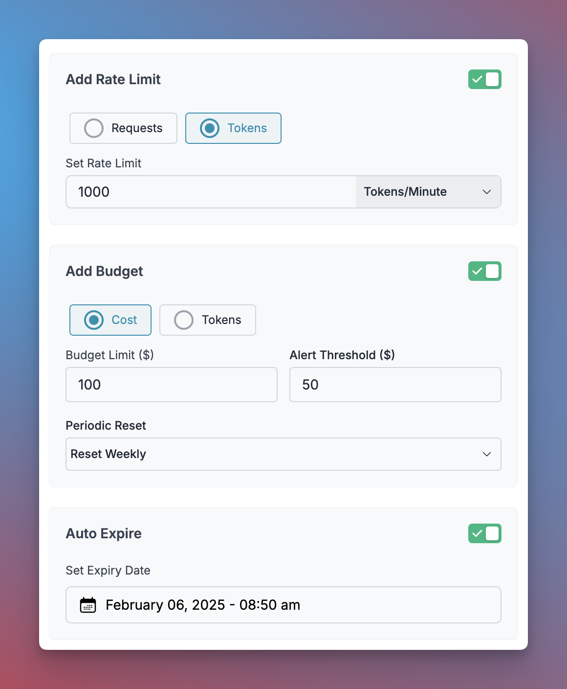 • Budget caps based on cost incurred or tokens consumed, with periodic reset options (weekly/monthly)